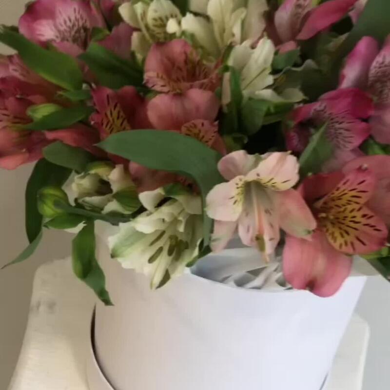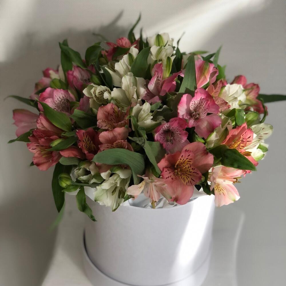 Альстромерия – 11 шт.Упаковка дизайнерская – 2 шт.Коробка шляпная – 1 шт.Пиафлор (оазис) – 1 шт.