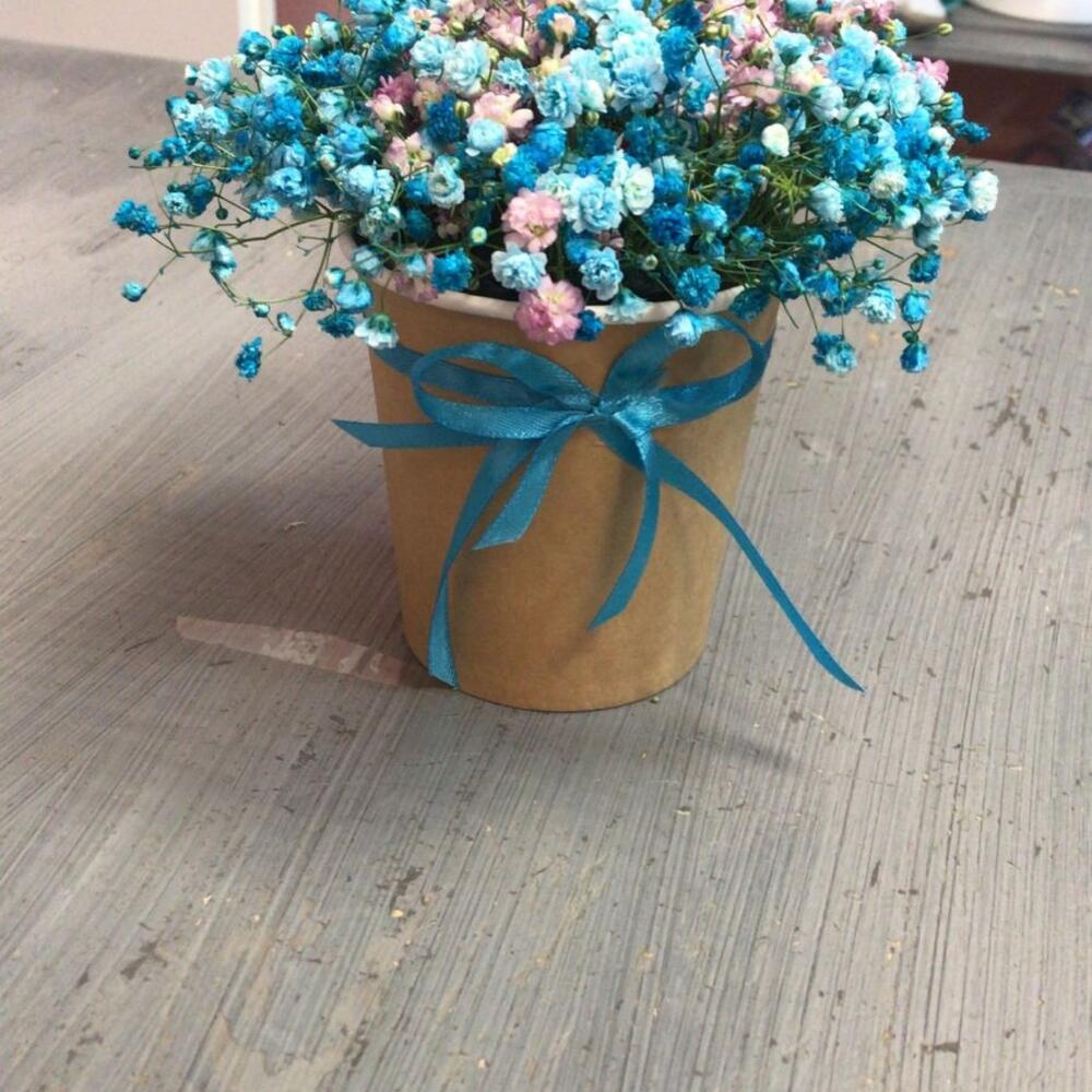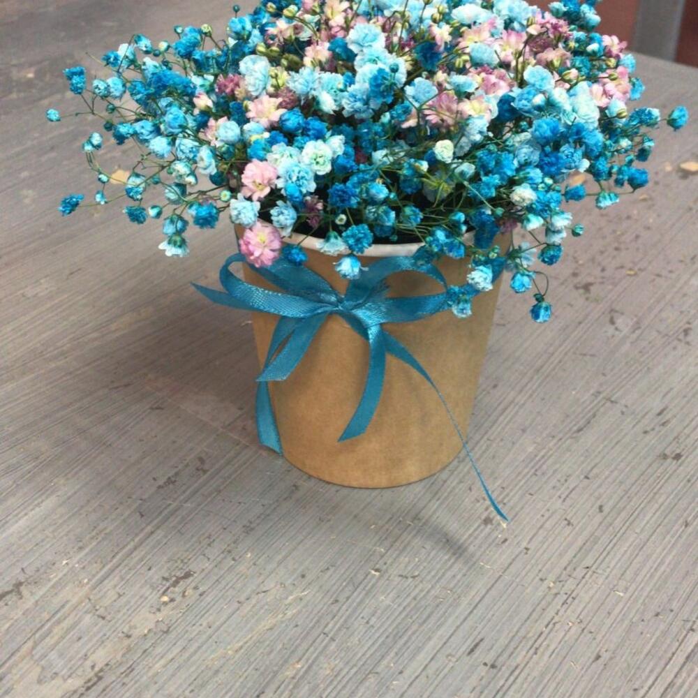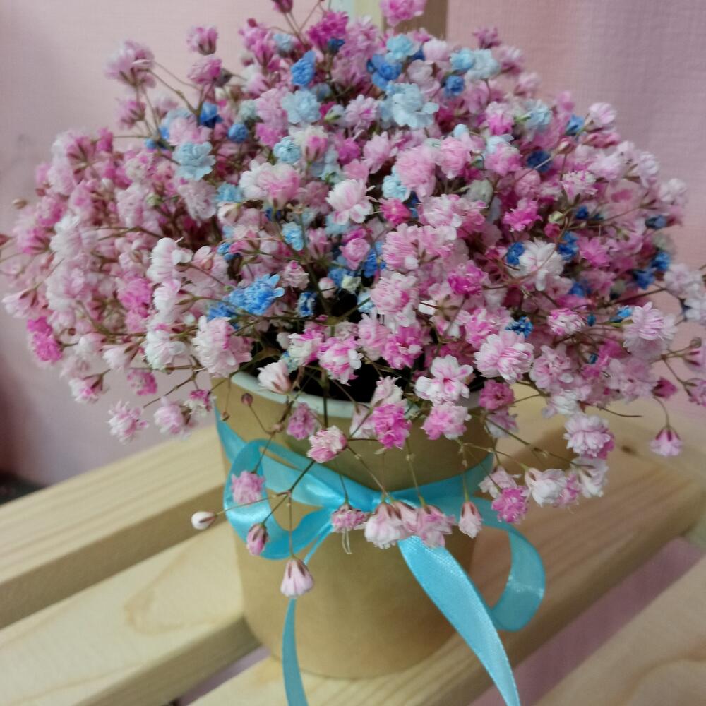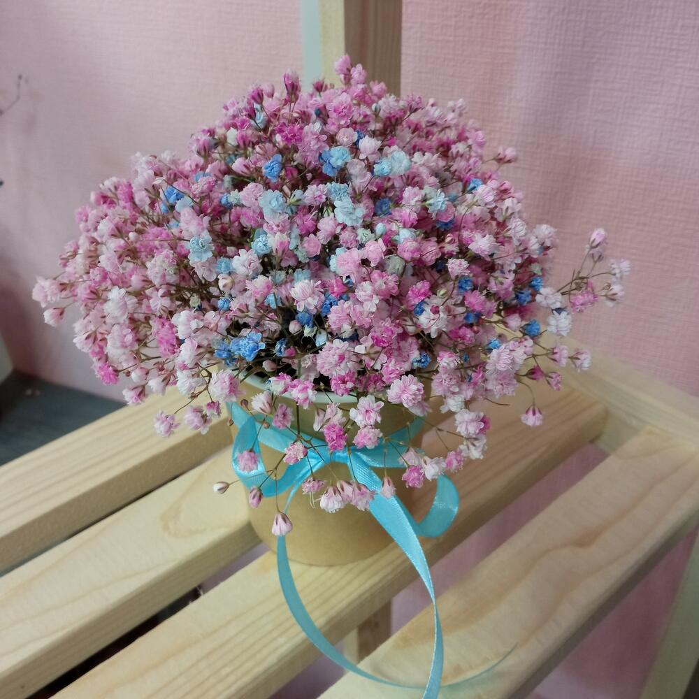 Микс гипсофилы, цвета могут быть разные, которые есть в наличии на момент заказа. Гипсофила радужная в флористическом стакане с использованием оазиса. Очень ароматный комплимент.