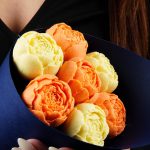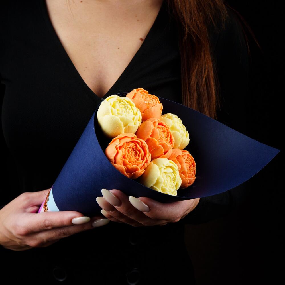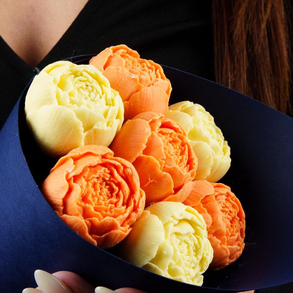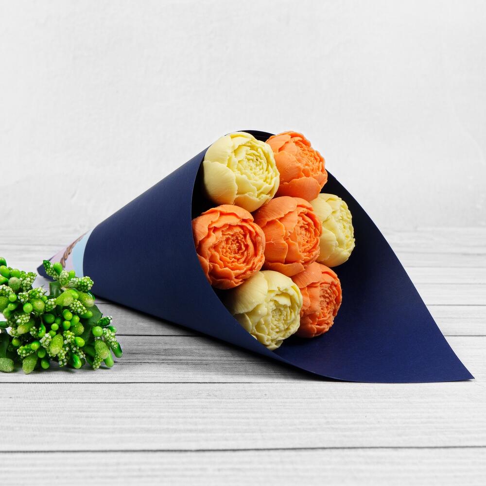 Упаковка Кулек – 1 шт.Прозрачная пленка – 1 шт.шоколадные пионы из бельгийского шоколада – 7 шт.