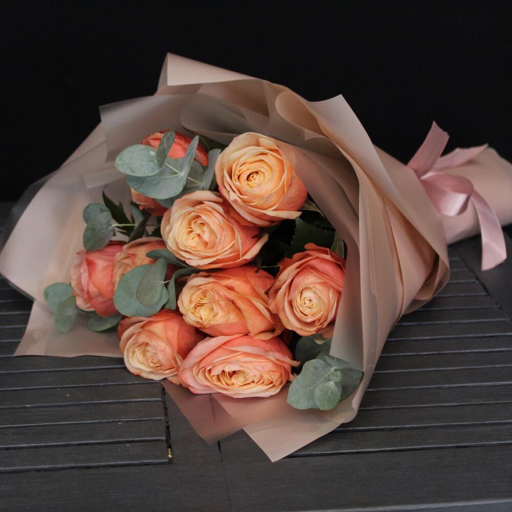 Роза пионовидная кахала – 9 шт.Эвкалипт – 3 шт.Пленка матовая – 4 шт.Лента атласная – 2 шт.