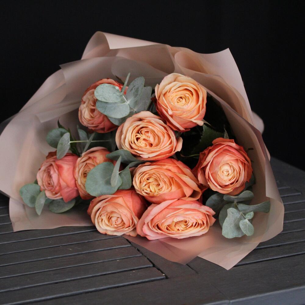 9 пионовидных роз kahala с эвкалиптом