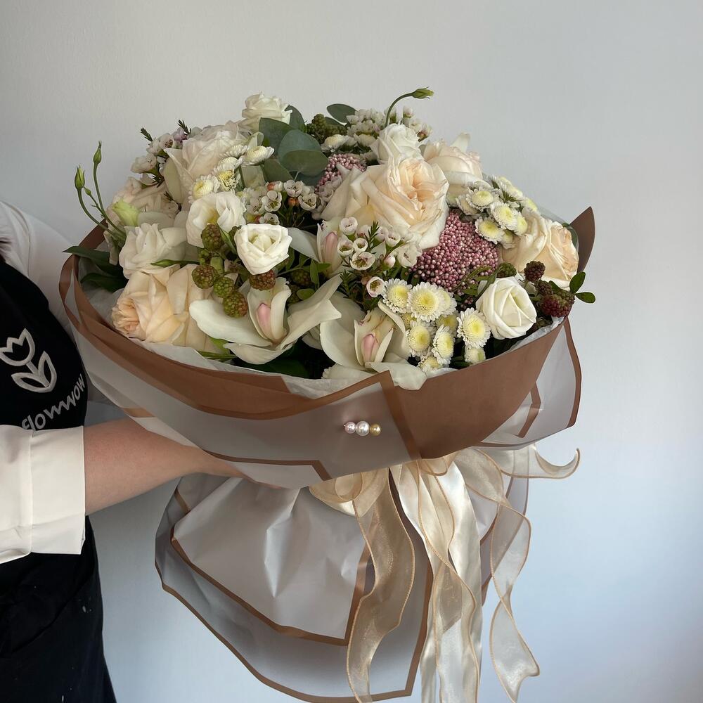 Ваксфлауэр – 2 шт.Лизиантус – 2 шт.Озотамнус – 4 шт.Эвкалипт – 2 шт.Роза Эквадор – 7 шт.Сантини – 5 шт.Фисташка – 4 шт.орхидея – 7 шт.Рубус – 4 шт.