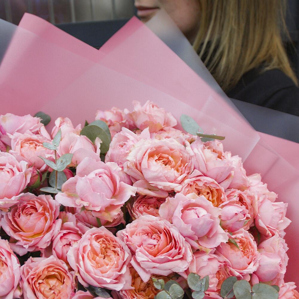 Большой букет из 15 кустовых пионовидных роз Джульетта с эвкалиптом