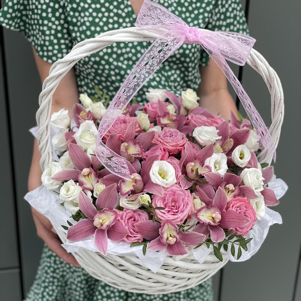 Корзина из цветков орхидеи, роз, эустомы и зелени!