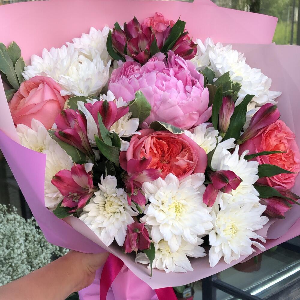 Пион Сара Бернар – 1 шт.Роза – 3 шт.Хризантема кустовая – 4 шт.Альстромерия – 3 шт.Питтоспорум – 3 шт.Оформление – 1 шт.