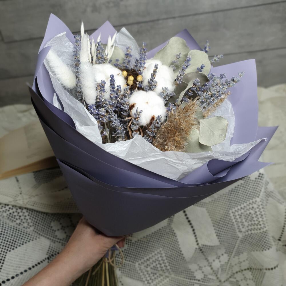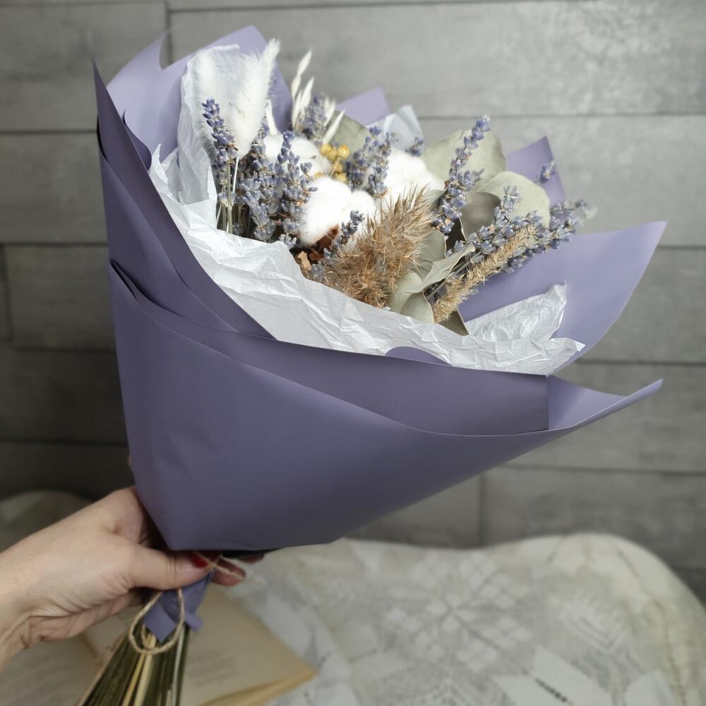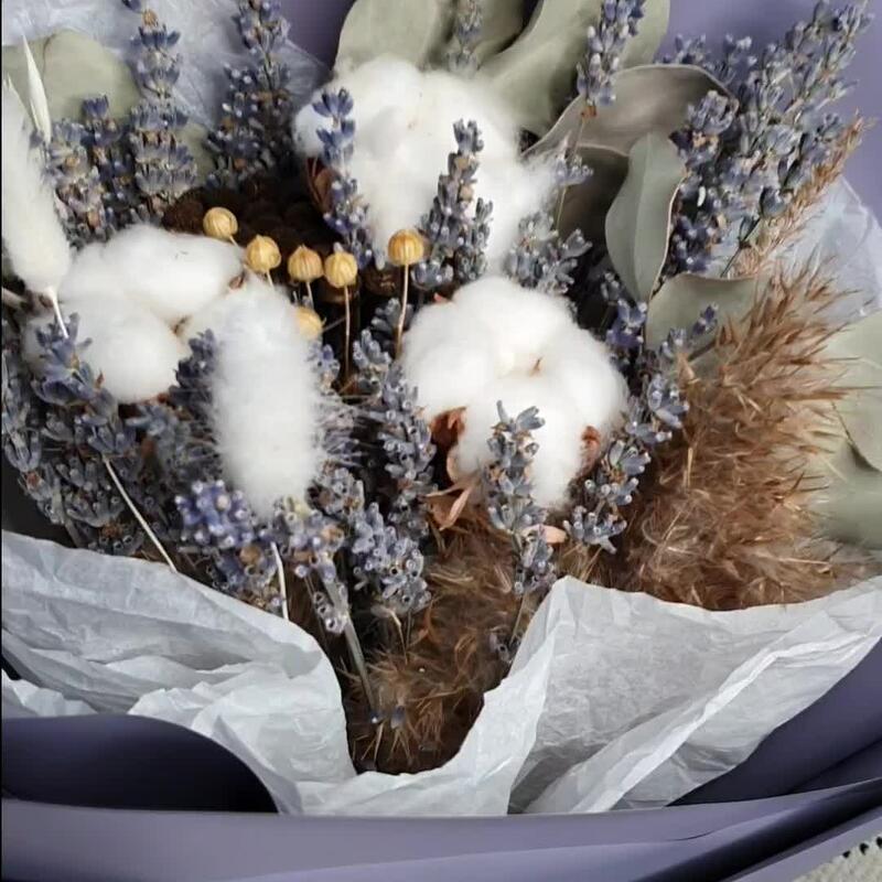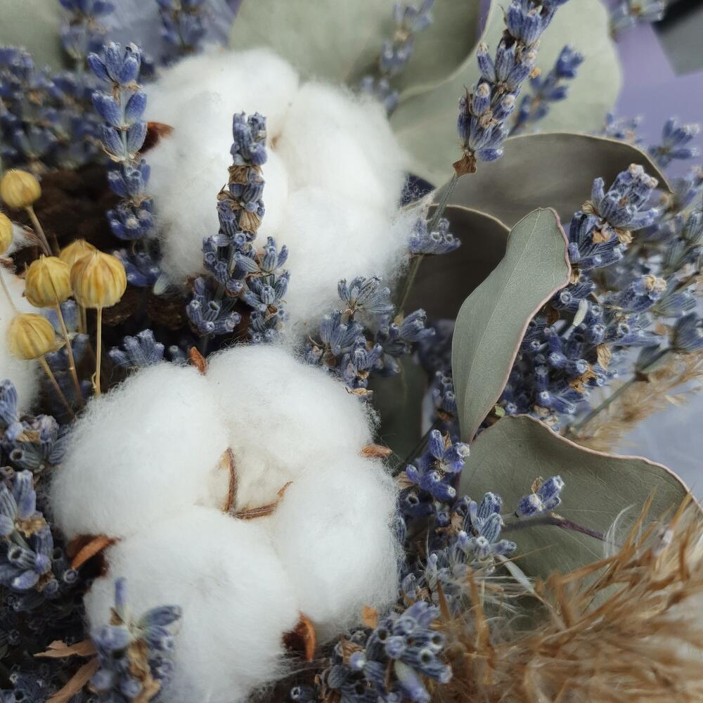 лавандин пучок – 1 шт.Хлопок – 3 шт.Лагурус – 3 шт.овес выбеленный – 2 шт.декоративный камыш банч – 1 шт.